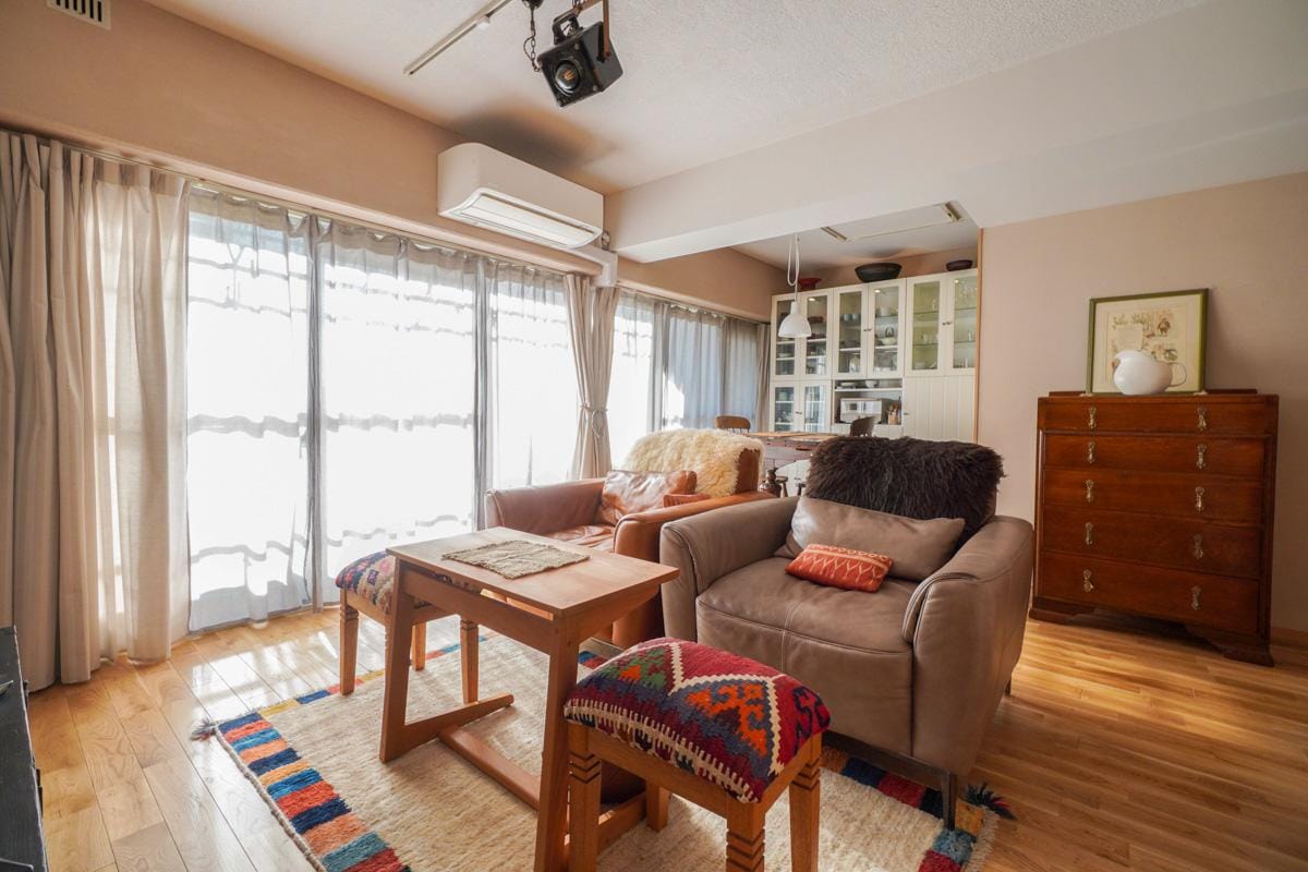 This is an unusual listing — a carefully renovated apartment in an older building that has been transformed into a genuinely livable, thoughtfully designed space. The current owners, who have a background in renovation, overhauled the unit in 2021 using high-quality natural materials. Highlights include Satsuma plasterwork on the living room walls (known for its humidity-regulating properties), solid oak flooring, custom-built shelving and a study area at the back of the LDK, and a well-designed open kitchen that balances visibility with a sense of enclosure.