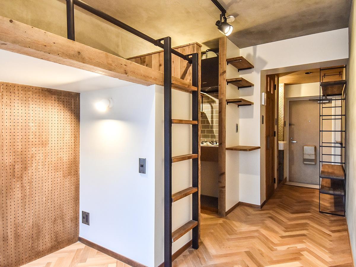 This 14.48 m² (156 ft²) apartment in Shimouma, Setagaya Ward, demonstrates how thoughtful design can maximize small urban spaces. Recently renovated in 2021, the one-room unit features a loft bed design, herringbone solid wood flooring, and industrial-style elements combining wood and iron.